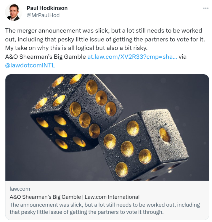 - Meg and I wrote a blog about our views on the announcement of the Allen & Overy and Shearman & Sterling merger.